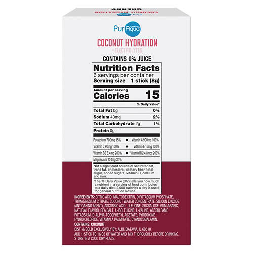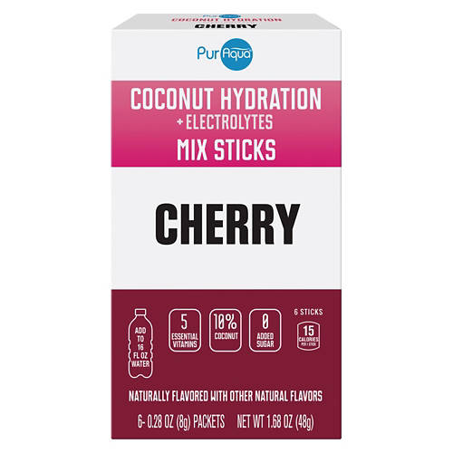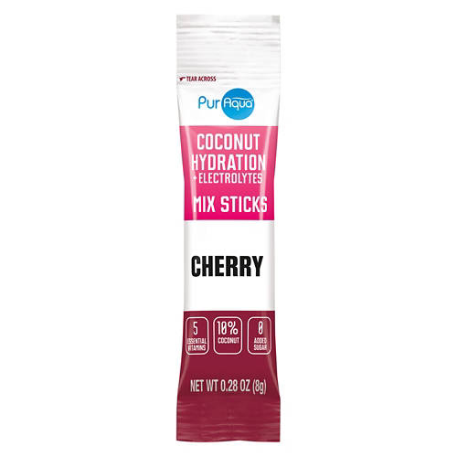 PurAqua Cherry - Coconut Hydration Sticks are your go-to solution for quick and effective hydration. Each stick is packed with 5 essential vitamins and contains zero added sugar. Simply add to 16 fl oz of water for a refreshing boost. Whether you're at the gym or on-the-go, these hydration sticks will keep you revitalized. Enjoy the natural cherry flavor and stay hydrated with ease.