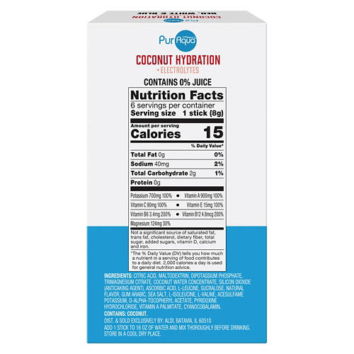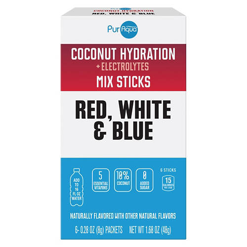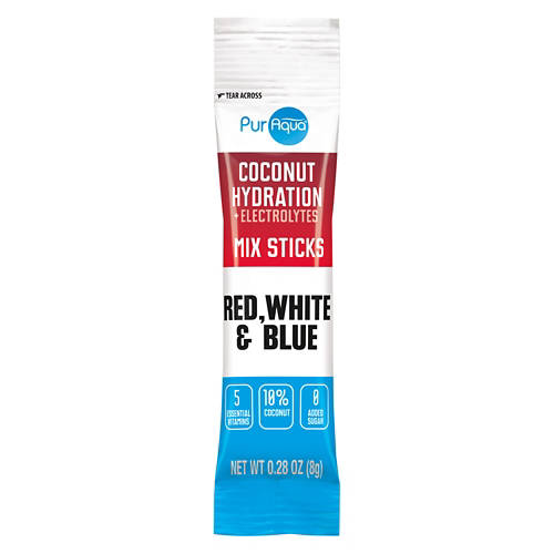 PurAqua Red, White & Blue Coconut Hydration Sticks are a refreshing way to stay hydrated. Each stick contains 10% coconut with 5 essential vitamins and zero added sugar. Simply add to water for a delicious drink with natural flavors. Ideal for boosting your hydration on the go or after a workout. Enjoy a burst of flavor and essential nutrients with every sip.
