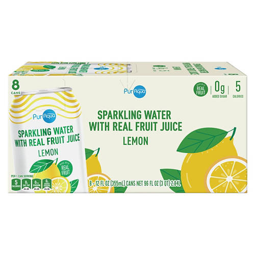 PurAqua Sparkling Water with Lemon Juice offers a refreshing burst of real fruit juice with zero added sugar and only 5 calories per can. It's the ideal drink for a health-conscious lifestyle. Enjoy it chilled on a hot day or as a zesty companion to your meals. With PurAqua Sparkling Water with Lemon Juice, you get a deliciously crisp beverage that’s both light and flavorful.