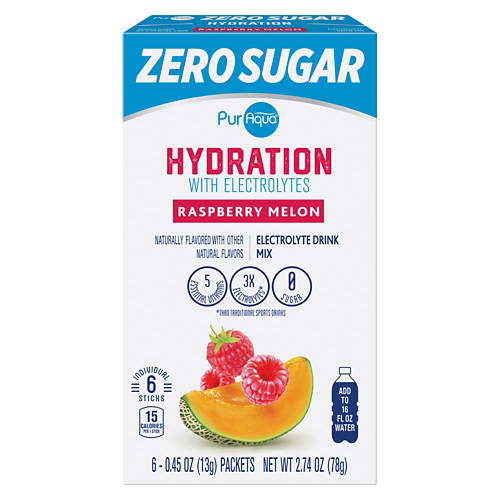 PurAqua Sugar Free Raspberry Melon Hydration Drink Mix Sticks are your go-to solution for a refreshing hydration boost. These drink mix sticks offer 3 times the electrolytes of traditional sports drinks. Simply add to 16 fl oz of water for a tasty, zero sugar beverage. Stay hydrated and enjoy the raspberry melon flavor.