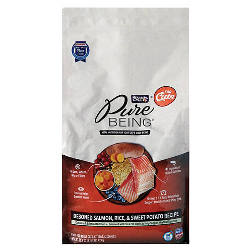 Your cat will love this Pure Being Salmon and Sweet Potato Cat Food! The dry cat food is packed with essential vitamins and minerals to support your kitty's vision, digestion, and skin health. With no wheat, corn, soy, or fillers, it's the perfect meal for your cat, whether for breakfast, lunch, or dinner!