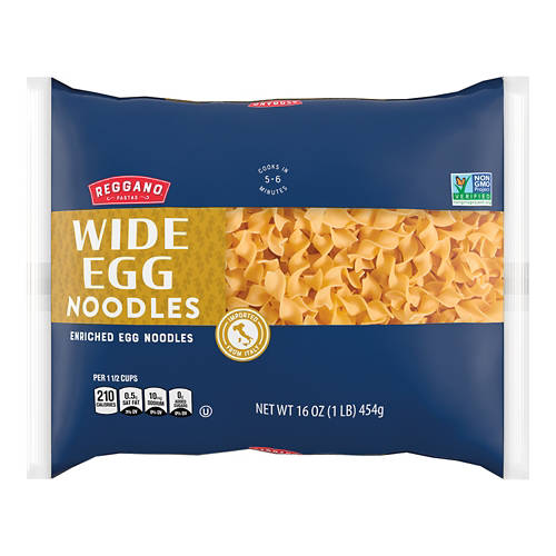 Reggano Wide Egg Noodles are a versatile addition to your pantry. These enriched egg noodles cook in just 6 to 8 minutes, making them perfect for quick meals. Toss them in your favorite pasta sauce, add to soups or use in casseroles for a hearty dish. Each serving provides 220 calories and 8 grams of protein, making it a satisfying choice. Add Reggano Wide Egg Noodles to your pantry today.