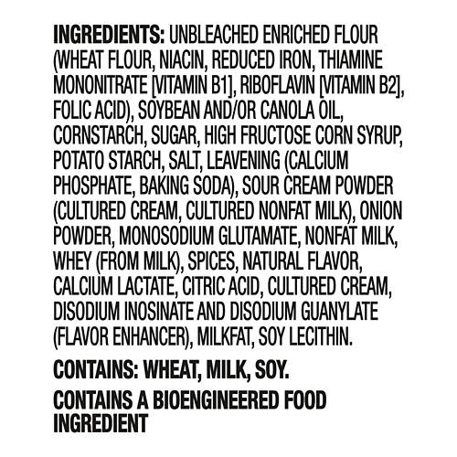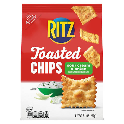Ritz Sour Cream & Onion Toasted Chips deliver a crunchy snack with natural flavors. Perfect for a quick snack or pairing with your favorite dips, these chips offer a satisfying crunch in every bite. Add Ritz Sour Cream & Onion Toasted Chips to your pantry for a tasty and convenient option.