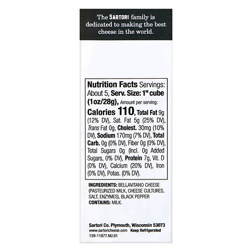 Sartori Cracked Black Pepper BellaVitano Cheese Wedge brings rich, nutty and creamy flavor with the bold kick of black pepper. This cheese can be savored on its own or paired with fruits and nuts for an elevated cheese board. Add it to your favorite recipes to enhance the taste with its unique blend. Experience the luxurious taste of Sartori Cracked Black Pepper BellaVitano Cheese Wedge in every bite.