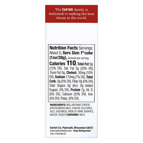 Sartori Merlot BellaVitano Cheese is a delightful blend of rich, creamy cheese and the berry and plum notes of Merlot. This cheese wedge elevates your cheese boards, pairs beautifully with fruits or nuts and can be the star of your next wine and cheese night. Experience the unique blend of flavors. Add Sartori Merlot BellaVitano Cheese to your cart today.