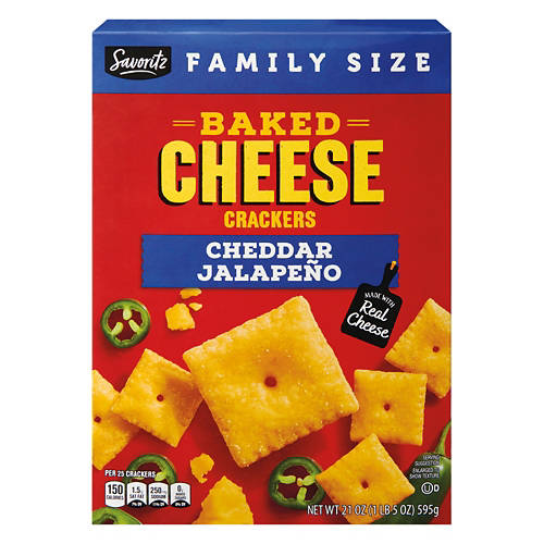 Savoritz Baked Cheddar Jalapeno Crackers are a bold choice for your next snack. Made with real cheese and a hint of jalapeno, these crackers offer a zesty kick that pairs well with soups and salads or on their own for a quick snack. Bring home this family size box and enjoy the spicy and cheesy goodness today.