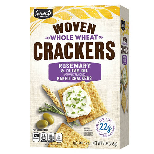 Instantly elevate your next charcuterie board with these Savoritz Rosemary & Olive Oil Woven Wheat Baked Crackers! Made with hearty whole grain, each baked cracker bursts with herbal rosemary and olive oil flavor. Team yours with creamy cheeses, cured meats, and dried fruits for the perfect party snack!