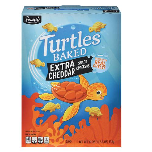 Savoritz Turtles Baked Extra Cheddar Snack Crackers are baked with real cheese and deliver a bold cheddar flavor in every bite. These playful turtle-shaped crackers are a fun addition to lunchboxes and make for an enjoyable, cheesy snack anytime. Dive into the rich taste of cheddar and enjoy these delightful crackers as a satisfying snack.
