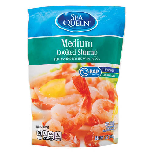 Sea Queen Medium Cooked Shrimp is peeled, deveined and comes with the tail on. Ready to eat, these shrimp are perfect for salads, pasta or as a standalone appetizer. Make a smart choice with these delicious shrimp, ideal for quick meals and entertaining. Add Sea Queen Medium Cooked Shrimp to your cart for a tasty and convenient seafood option.
