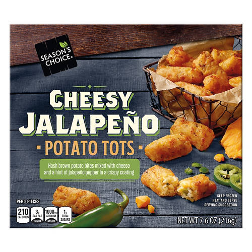 Take your party spread to the next level with these Season's Choice Cheesy Jalapeño Potato Tots! Each crispy hash brown potato bite is packed with creamy cheese and spicy jalapeño pieces for a burst of flavor in every bite. Team yours with sizzling wings and savory dips for the perfect game-time snacks!