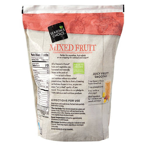 Season's Choice Frozen Mixed Fruit Blend is a delightful mix of strawberries, pineapple, mango, and peaches. Ideal for smoothies, desserts or adding a fruity twist to your breakfast cereal. Each bite is packed with natural sweetness and a good source of Vitamin C. Keep it in your freezer to have a versatile fruit option ready whenever you need it. Enjoy the taste and convenience of this frozen fruit blend.