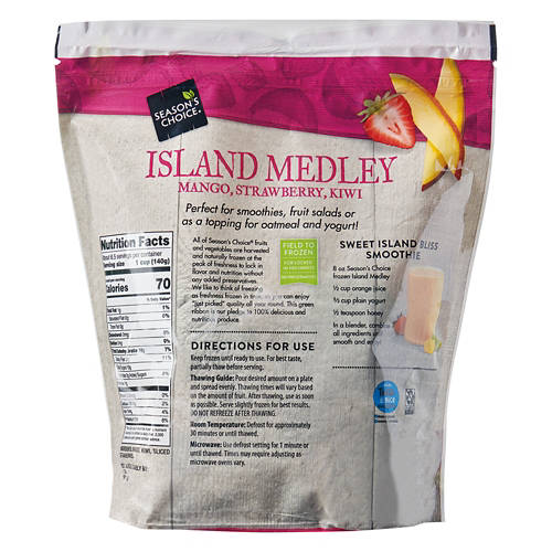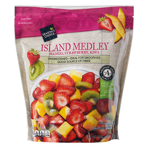 Enjoying your favorite fruits is easy with this Season's Choice Island Medley Frozen Fruit Blend! The blend features unsweetened strawberry, kiwi, and mango slices that are packed with fiber. Toss a cup of fruit into a blender with ice, yogurt, and a scoop of protein powder for the perfect start to your day!