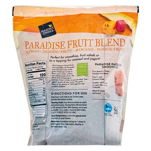 Take your mornings to the next level with this Season's Choice Paradise Frozen Fruit Blend! The unsweetened frozen fruit blend features fiber-rich mango, avocado, passion fruit, and dragon fruit chunks that are packed with Vitamin C. Use yours in a protein smoothie or a smoothie and granola bowl for the perfect start to your day!