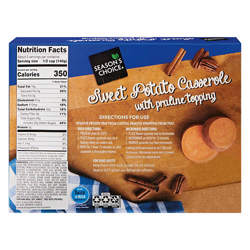 Season's Choice Sweet Potato Casserole is a delicious and hearty side dish that's perfect for any meal. This casserole features sweet potatoes topped with a praline topping, providing a delightful blend of flavors and textures. Simply heat it up and serve it alongside your favorite main dishes for an easy and satisfying addition to your dinner table. Enjoy the comforting taste of sweet potatoes with Season's Choice Sweet Potato Casserole.