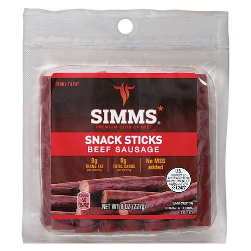 Stay satisfied on the go with these Simms Beef Sausage Snack Sticks. Made with premium cuts of beef, each protein-packed sausage stick has 0 grams of trans fat, carbs, and added MSG per serving. Enjoy yours at the office as you knock out your to-do list, or bring them to the gym for some post-workout fuel.