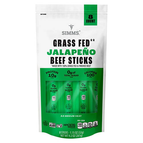 Simms Jalapeno Grass Fed Beef Sticks pack a punch with 10g of protein and 0g of total sugar per stick. Made with 100% grass fed and finished beef, these sticks offer a medium heat kick that's perfect for a quick energy boost. Each stick contains just 100 calories, making it an ideal choice for a protein-rich snack. Enjoy the bold jalapeno flavor and quality ingredients in every bite.