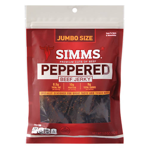 Simms Peppered Premium Cut Beef Jerky is specially seasoned for great taste and tenderness. With 10g of protein per serving, it's a satisfying option for a quick energy boost. Enjoy it during a busy workday or as a tasty addition to your outdoor adventures. This jumbo size pack ensures you have plenty to share or keep for yourself. Indulge in the bold, peppery flavor and tender texture of Simms Peppered Beef Jerky.