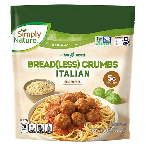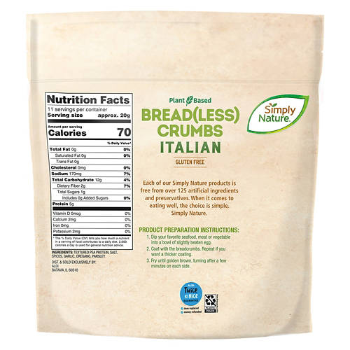 Simply Nature Gluten Free Italian Breadless Crumbs are a plant-based, non-GMO alternative to traditional breadcrumbs. With 5g of protein per serving, they add a delicious crunch to your favorite dishes. Use them to coat chicken or fish, top casseroles or mix into meatballs for added texture. With 70 calories and zero saturated fat per serving, these breadless crumbs are a smart choice for enhancing your meals with a healthy, gluten-free option.