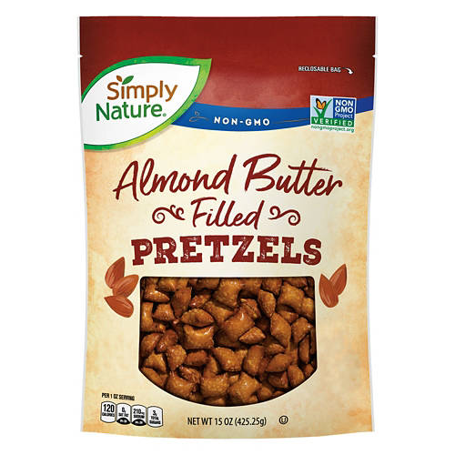 Sweeten up your snack break with these Simply Nature Non-GMO Almond Butter Filled Pretzels. Each crispy, crunchy pretzel is dusted with salt and filled with smooth and creamy almond butter. Enjoy the non-GMO verified treats on their own or in a homemade trail mix for the perfect sweet and salty bite.