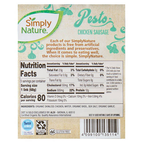 Take your favorite recipes up a notch with this Simply Nature Organic Pesto Chicken Sausage! Made with premium cuts of chicken, the gluten free sausages are packed with flavorful pesto and have no added antibiotics. Add yours to a tomato-based pasta dish to instantly elevate your dinner!
