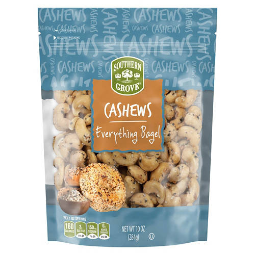 Southern Grove Cashews Everything Bagel delivers a flavorful twist to your snack time with the bold taste of everything bagel seasoning. These cashews are roasted to perfection and coated in a savory blend of sesame seeds, poppy seeds, garlic and onion. Enjoy them straight from the bag or add to salads and charcuterie boards for an extra crunch. Enjoy this delectably seasoned nut blend that's sure to satisfy.