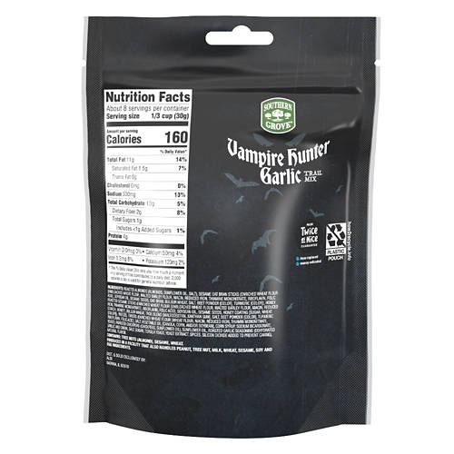Southern Grove Vampire Hunter Garlic Trail Mix is a bold blend of roasted almonds, sesame oat bran sticks, honey roasted sesame sticks, pretzels, roasted chickpeas and garlic seasoning. This mix is perfect for a quick snack or party dish. Satisfy cravings with the unique garlic flavor of Southern Grove Vampire Hunter Garlic Trail Mix.