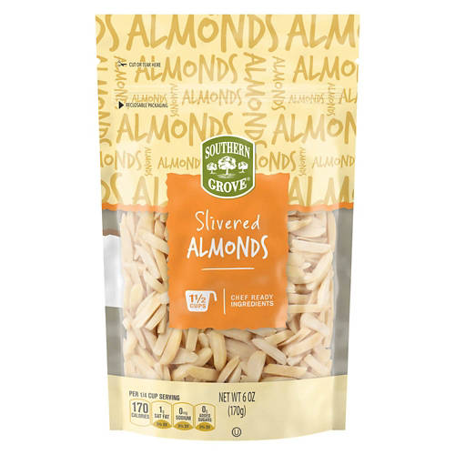 Southern Grove Slivered Almonds are a chef-ready ingredient perfect for enhancing your favorite dishes. These almonds add a delightful crunch to salads, baked goods and more. They contain 1g of saturated fat and no sodium, making them a wholesome addition to your kitchen. Elevate your meals with the quality and taste of Southern Grove Slivered Almonds.