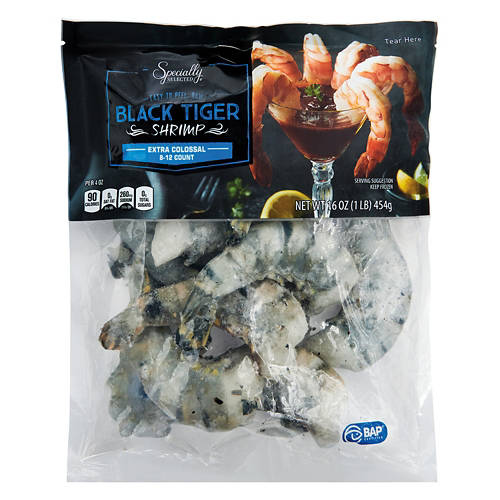 Indulge in Specially Selected Extra Colossal Raw Black Tiger Shrimp. These premium shrimp are ideal for grilling, sautéing or adding to your favorite pasta dishes. With 8-12 shrimp per pound, they offer a hearty bite and rich flavor. Elevate your meals with these high-quality shrimp and enjoy a delicious seafood experience.