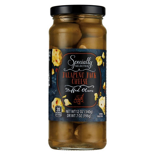 Specially Selected Jalapeño Jack Cheese Stuffed Olives are a bold addition to your pantry. Each olive is generously filled with creamy jalapeño jack cheese, offering a zesty kick with every bite. Perfect for enhancing your charcuterie board or adding a flavorful twist to your salads and pasta dishes. With only 20 calories per serving, these olives are a tasty way to elevate your meals.