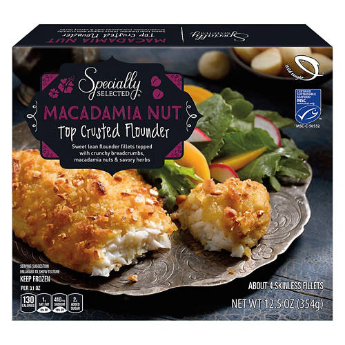 This Specially Selected Macadamia Nut Top Crusted Flounder is a delightful choice for seafood lovers. Each sweet lean flounder fillet is topped with crunchy breadcrumbs, macadamia nuts and savory herbs. Ideal for a quick dinner, just bake and serve with your favorite sides for a gourmet meal at home. It's an easy way to enjoy a flavorful and satisfying dish. Add it to your cart and savor the taste.