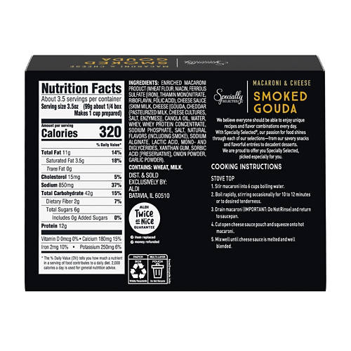Specially Selected Smoked Gouda Macaroni & Cheese delivers a gourmet twist on a classic dish. This pasta features rich, smoked Gouda cheese for a sophisticated flavor profile. Perfect for a quick lunch or an indulgent dinner side, it brings a touch of luxury to your meals. Satisfy your cravings with this creamy, savory macaroni that pairs well with a fresh salad or roasted vegetables.
