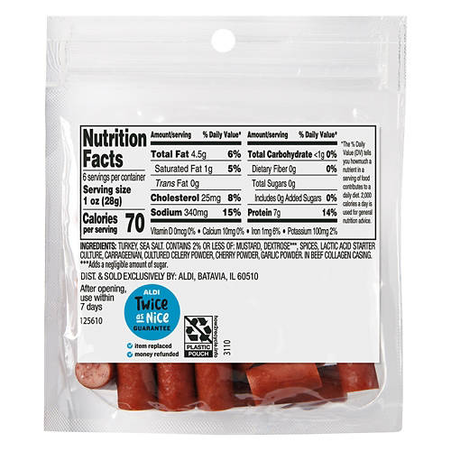 Specially Selected Turkey Sausage Zero Sugar Snack Bites offer a tasty and nutritious option with 7g of protein per serving. Made with 100% natural turkey, these bites are free from added sugars and artificial ingredients. They are perfect for a quick protein boost during busy days. Enjoy them straight from the pack or add them to your favorite salad for extra flavor. Keep them on hand for a tasty, nutritious option that fits easily into your lifestyle.