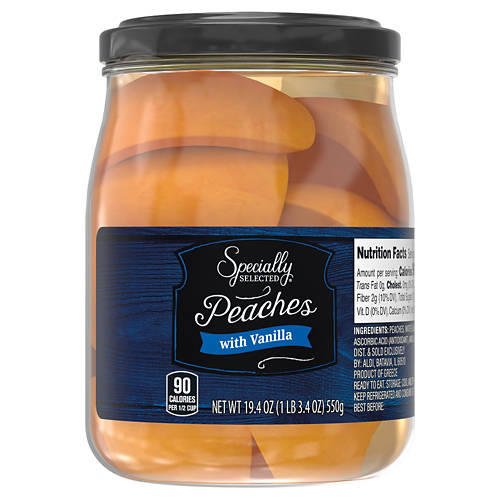 Specially Selected Peaches with Vanilla offer a delightful twist to your desserts or breakfast. These peaches, infused with a hint of vanilla, add a sweet and aromatic flavor to yogurt, ice cream or baked goods. Enjoy the rich, flavorful experience of Specially Selected Peaches with Vanilla in your favorite recipes.