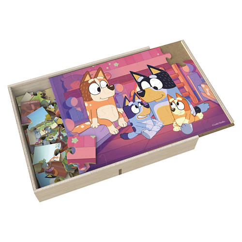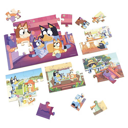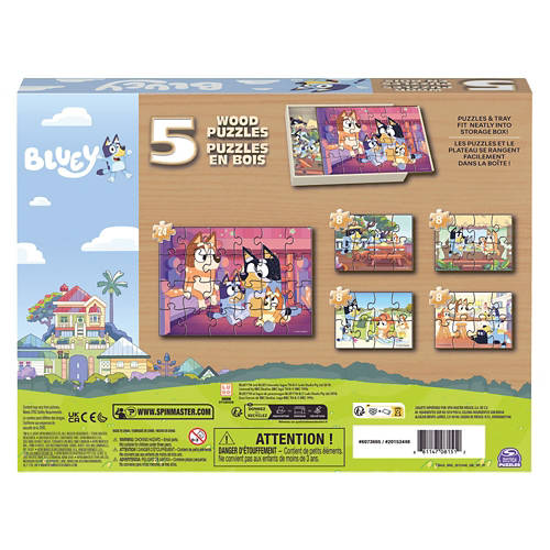 Bluey: Join in on the fun with the Bluey 5-Pack Wood Puzzles Collection. Featuring cartoon artwork of beloved Bluey characters, this collection offers five delightful puzzles in one box, making it a fun and engaging screenless activity for young ones. With puzzles measuring 11.2"x8.4" and 5.6"x2.3", they are designed for easy handling by little hands. All puzzles are securely stored in a wooden box with a sliding lid, ensuring all pieces are kept safe and organized. The set includes both 8-piece and 24-piece puzzles, allowing children to develop fine motor skills and problem-solving abilities as they progress from simpler to more complex designs. Whether for birthdays, holidays, or everyday gifting, these puzzles offer a thoughtful way to inspire learning and creativity. Spin Master brings the fun of children's entertainment home with a range of kids toys and games, including baby toys, toys for girls, board games, stuffed animals, fidget toys, RC cars, action figures, dolls and more. Get creative with arts and crafts and building toys and take the action to the table with jigsaw puzzles for adults or card games. From gifts for men to baby registry gifts and toddler toys, make gifting a breeze with our diverse catalog of toys for kids.