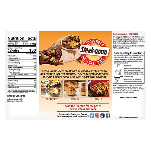 Steak-umm 100% All Beef Sliced Steaks are your solution for a quick and delicious meal. These chopped, shaped and thinly sliced steaks are perfect for making classic Philly cheese steaks, stir-fries or beef sandwiches. With 100% beef, you get pure, savory flavor in every bite. Ideal for a tasty lunch option or busy weeknights. Enjoy the quality and taste of Steak-umm Sliced Steaks today.