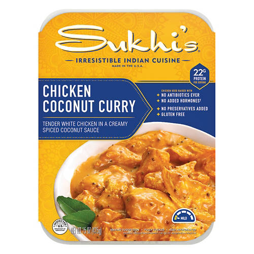Sukhi's Chicken Coconut Curry features tender white chicken in a creamy spiced coconut sauce. With no antibiotics, no added hormones and no preservatives, this gluten-free dish offers 22g of protein per serving. Enjoy it as a quick dinner option or pair it with rice and naan for an authentic meal. This mild curry is fully cooked and ready to heat, making it easy to savor delicious Indian cuisine at home.