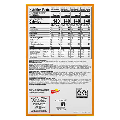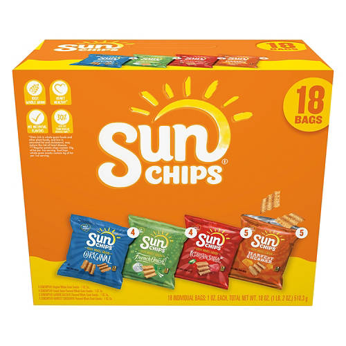 SunChips Variety Snack Packs are an assortment of delicious multigrain snacks featuring Original, Harvest Cheddar, Garden Salsa and French Onion flavors. Each serving is heart-healthy with 30% less fat than regular potato chips. Made without artificial flavors or preservatives, these snacks use whole grains for a wholesome bite. Perfect for lunches or on-the-go, SunChips Variety Packs make it easy to enjoy a flavorful snack anytime.
