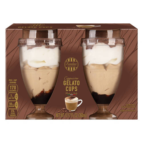 Indulge in the rich, creamy delight of Sundae Shoppe Cappuccino Italian Gelato Cups. Each cup contains smooth cappuccino-flavored gelato, topped with a velvety layer of whipped cream. Perfect for enjoying after dinner. Enjoy the luxurious flavor and treat yourself to a moment of pure bliss.