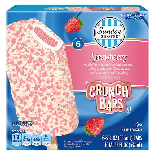 Stay cool under the sun with these Sundae Shoppe Strawberry Ice Cream Crunch Bars! Each frozen treat bar features a strawberry core surrounded by reduced fat vanilla ice cream and a crunchy strawberry cake coating. Enjoy yours at the beach or at home by the pool for the perfect summertime treat!