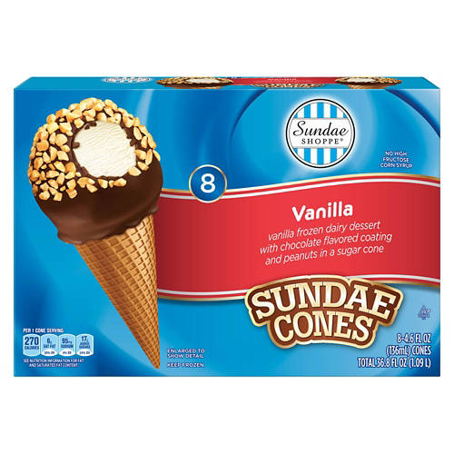 Indulge in these Sundae Shoppe Vanilla Sundae Nut Cones. Each cone features creamy vanilla frozen dairy dessert with a rich chocolate-flavored coating and crunchy peanuts, all nestled in a crispy sugar cone. Ideal for family gatherings or a simple dessert after dinner. Keep a box of these cones in your freezer for a delightful, sweet treat anytime.