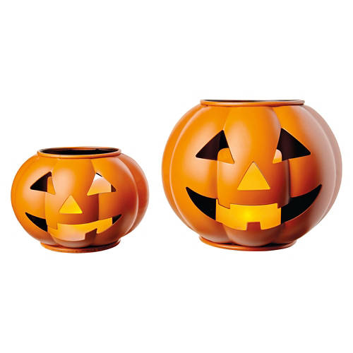 Get Spooky with our LED Metal Jack-O-Lanterns. These are great to stack, or decorate separately. Handcrafted of Iron Comes with LED Pillar Candle Requires 3 AAA batteries (sold separately) Time function: 6 hours on/18 hours off Indoor or Outdoor covered use only