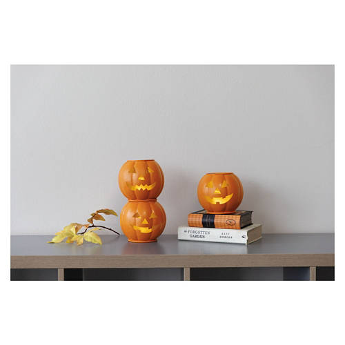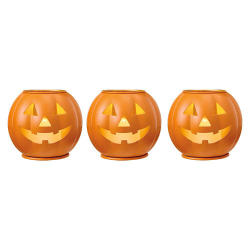 Get Spooky with our 3pk Small Metal Jack-O-Lanterns. These are great to stack, or decorate separately. Handcrafted of Iron Comes with LED Pillar Candle Requires 2 AAA batteries (sold separately) Time function: 6 hours on/18 hours off 5 in. H x 6 in. Dia Indoor or Outdoor covered use only