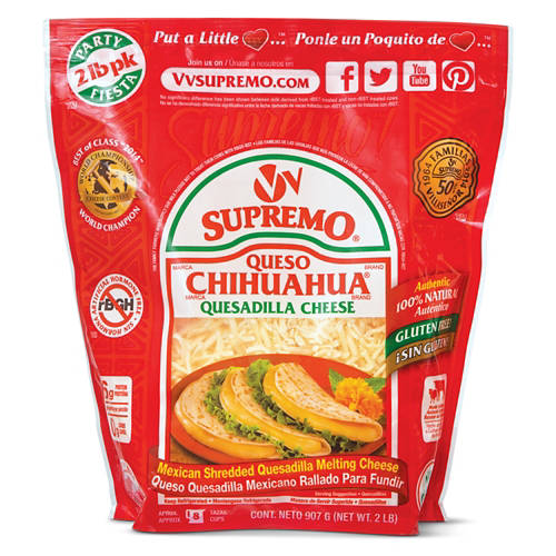 Craft the perfect cheesy dish with V&V Supremo Shredded Queso Chihuahua Quesadilla Cheese. The authentic Mexican cheese is free of artificial growth hormones, gluten free, and 100% natural, so you know you're making the healthiest choice. It has the perfect melt to complete a delicious, savory quesadilla.