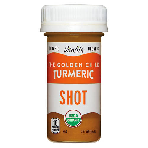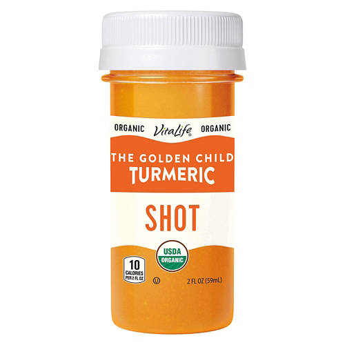 VitaLife The Golden Child Turmeric Shot is a powerful blend of organic coconut water, pineapple juice, turmeric juice, lemon juice and ground black pepper. Each shot packs a zesty punch with just 15 calories. Start your day with this energy boost or add it to smoothies for an extra kick.