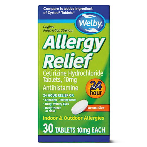 Shop for Welby 24 Hour Allergy Relief from ALDI. This prescription-strength allergy medication helps with sneezing, runny nose, itchy and watery eyes, and even an itchy throat. Whether you are looking for seasonal protection, relief from your furry friends and more, grab a box of 24 hour indoor and outdoor relief. With 30 tablets in each package, you will be set for the whole month.