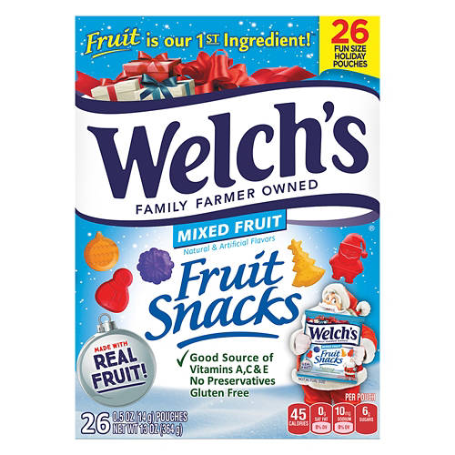 Welch's Gluten Free Holiday Fruit Snacks are made with real fruit and are a good source of vitamins A, C and E. These fruit snacks contain no preservatives. These fun-size holiday pouches are perfect for festive gatherings or everyday enjoyment. Enjoy a delightful treat with Welch's Gluten Free Holiday Fruit Snacks.