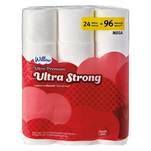 Willow Ultra Premium Ultra Strong Bath Tissue ensures you get the job done right. With 24 mega rolls equal to 96 regular rolls, this two-ply tissue is septic safe and ultra strong. Ideal for busy households and large families, this tissue provides the strength you need with every use. Make the smart choice for your bathroom essentials with Willow Ultra Premium Ultra Strong Bath Tissue.