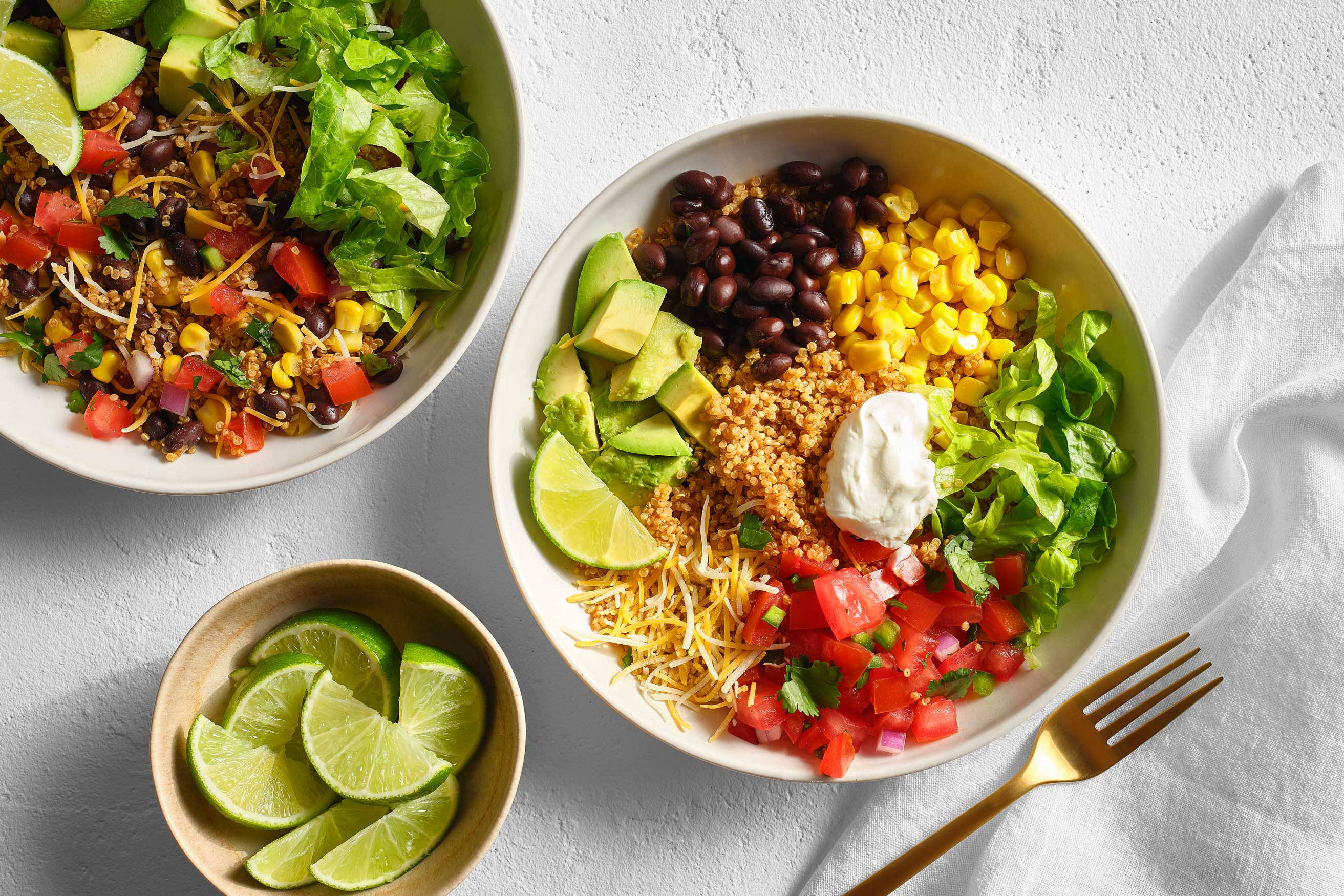 - In a large bowl, combine quinoa, black beans, corn and pico de gallo. Divide into serving bowls and top with cheese, lettuce, avocado and sour cream.